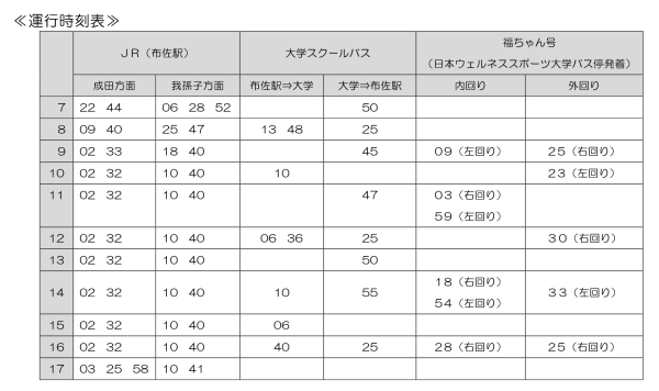 ★日本ウェルネススポーツ大学様のご厚意により,大学の授業がある平日のみ試行運転となりますが,大学のスクールバス【布佐駅行き・大学行き】が無料で利用できるようになります。(試行期間については,未定となっております。)